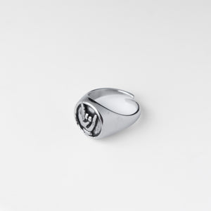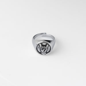 Anello in acciaio inossidabile con un design audace e distintivo, caratterizzato dal simbolo "Corna" inciso sulla parte frontale.
