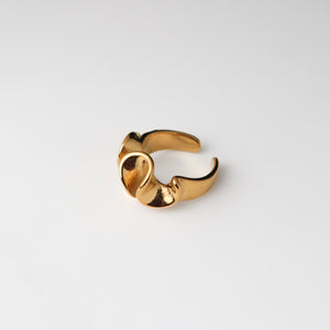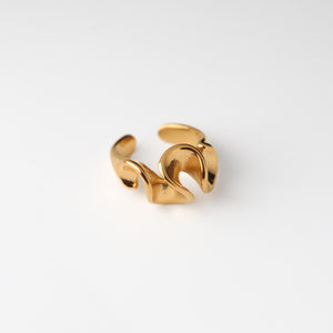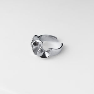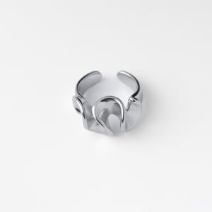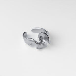 Realizzato in acciaio inossidabile, questo anello si distingue per le sue forme fluide e organiche, che evocano un senso di movimento e vita.