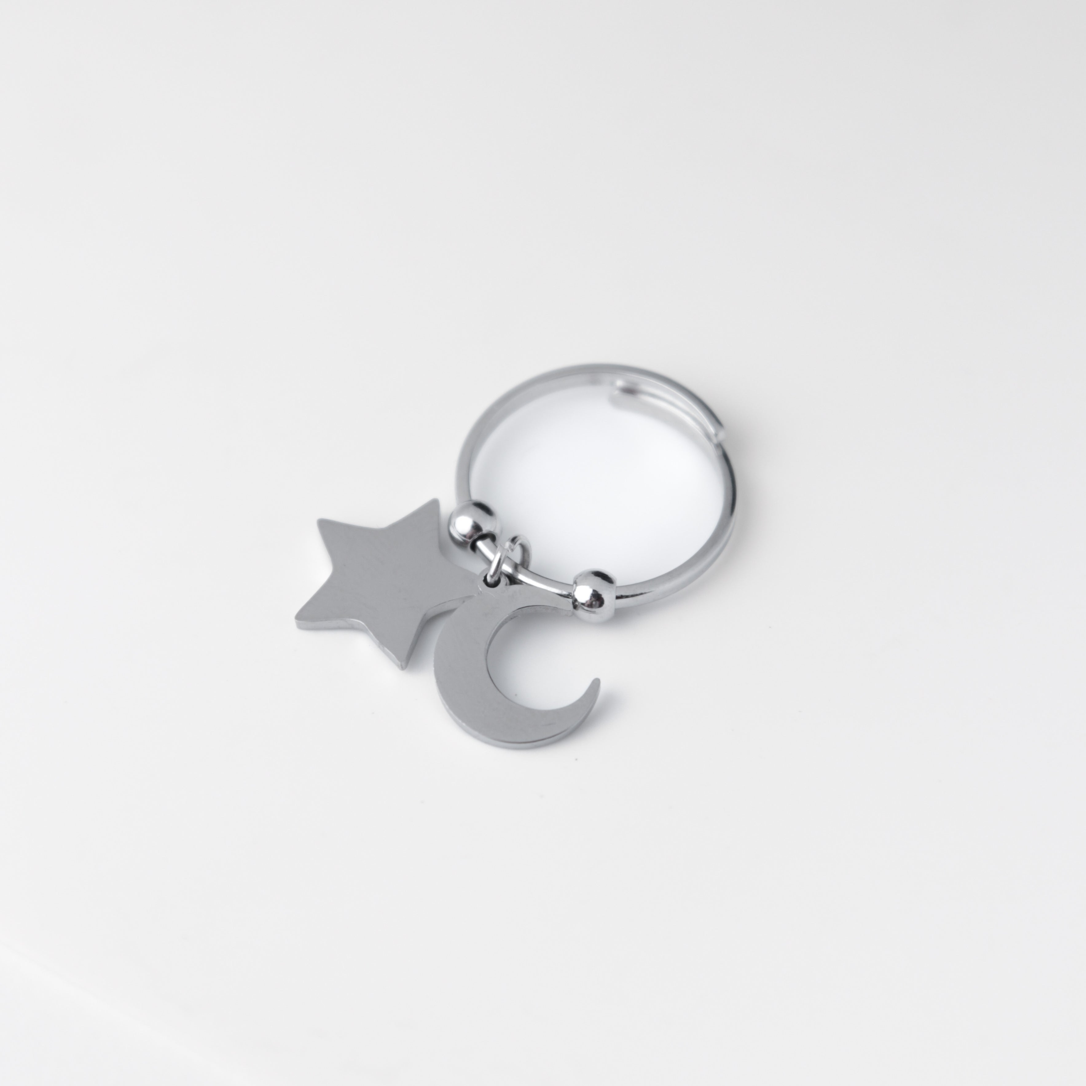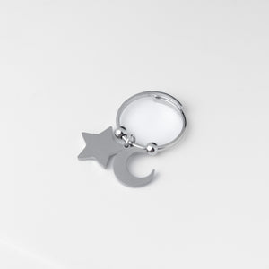 Realizzato in acciaio inossidabile di alta qualità, questo anello combina una stella e una luna pendenti, creando un design unico e affascinante che cattura l'essenza del cielo notturno.
