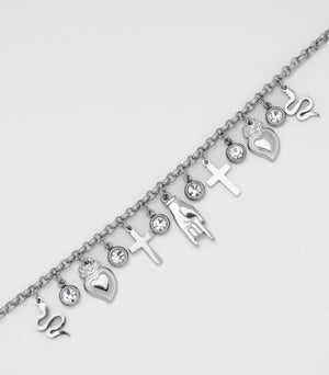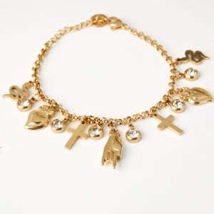 Questo bracciale charm religiosi in acciaio inossidabile dorato è l'accessorio perfetto per aggiungere un tocco di significato e raffinatezza al tuo look quotidiano. Perfetto come regalo per una persona speciale o come aggiunta distintiva alla tua collezione di gioielli. Indossalo per esprimere la tua fede e il tuo stile unico con eleganza.