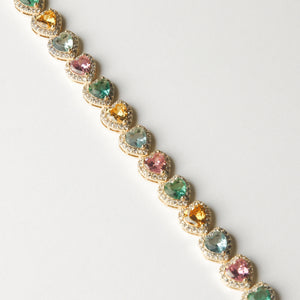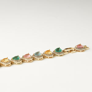Aggiungi un tocco di lusso e colore al tuo polso con il nostro bracciale Essenza di Cuori Luxury. Questo splendido bracciale è composto da cuori in cristallo colorato, ciascuno circondato da una scintillante cornice di pietre preziose. I cuori nelle tonalità di rosa, blu, giallo e verde creano un effetto vibrante e armonioso, perfetto per qualsiasi outfit. La struttura dorata in acciaio inossidabile offre durabilità e una finitura elegante, mentre la chiusura sicura garantisce una vestibilità comoda e affidabile.