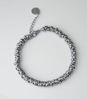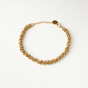 Aggiungi un tocco di eleganza senza tempo al tuo stile con il nostro bracciale Nanny in acciaio inossidabile dorato. Questo raffinato bracciale è composto da una serie di anelli dorati finemente intrecciati, creando un design sofisticato e dinamico. La lucentezza dell'acciaio inossidabile dorato conferisce un aspetto lussuoso e moderno, mentre la chiusura regolabile a moschettone assicura una vestibilità comoda e sicura. Ideale per completare qualsiasi outfit, sia casual che elegante, questo bracciale è perfetto per ogni occasione.