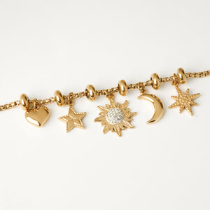 Descrizione: Esplora la bellezza del cosmo con il nostro bracciale Sole in acciaio inossidabile. Questo affascinante bracciale è decorato con una serie di ciondoli celesti, tra cui una luna, un sole, stelle e un cuore, tutti progettati per catturare la magia del cielo notturno. Ogni ciondolo è dettagliato con precisione e arricchito con elementi brillanti per aggiungere un tocco di scintillio. La finitura in argento lucido conferisce un aspetto moderno e sofisticato, mentre la catena regolabile con chiusura a moschettone assicura una vestibilità comoda e sicura.