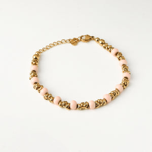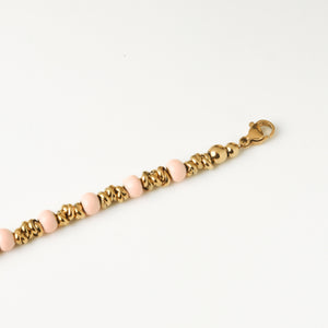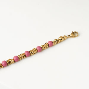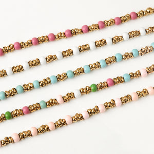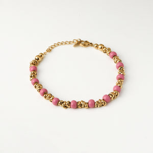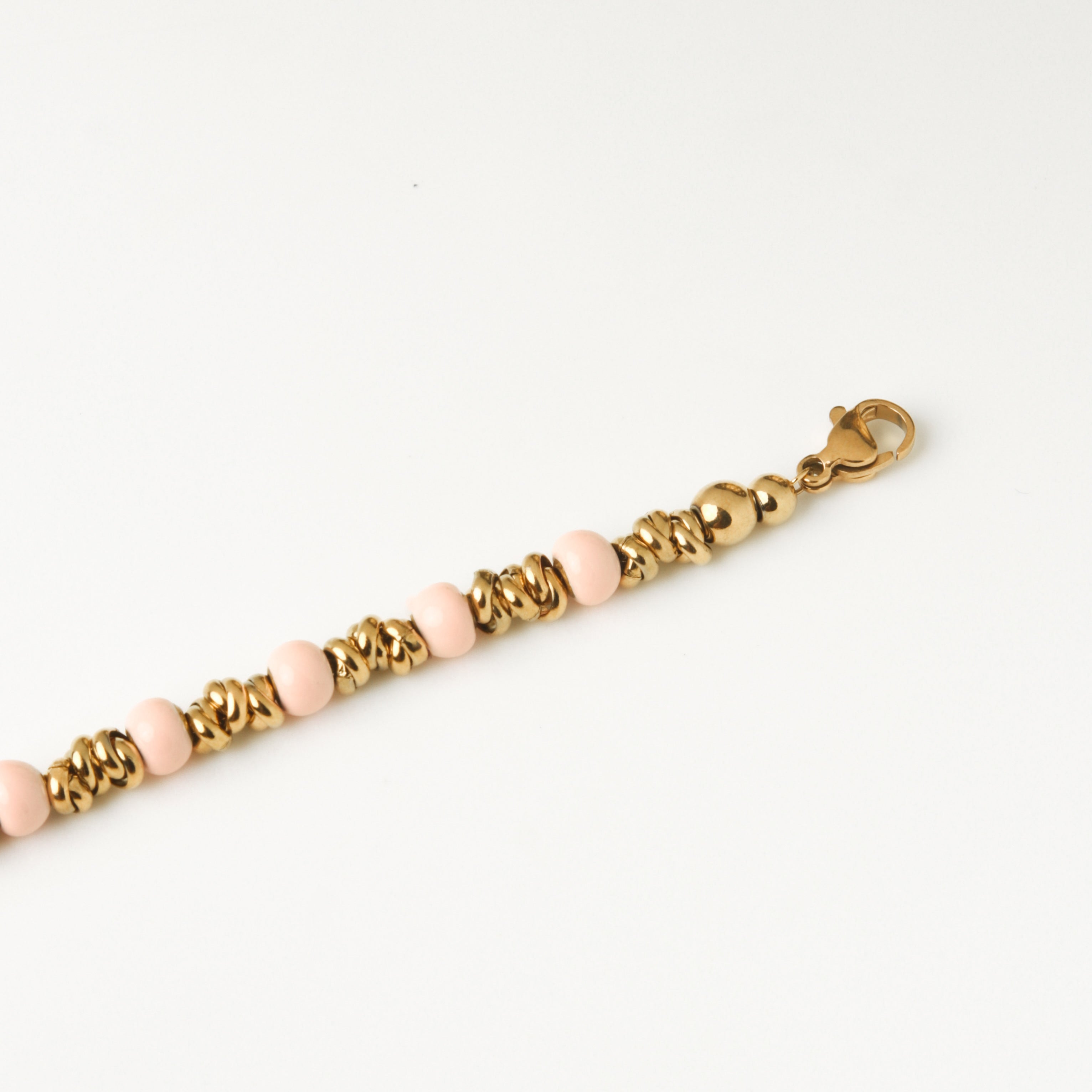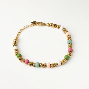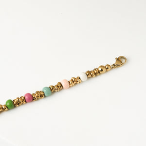 Scopri la vivacità e la versatilità dei nostri bracciali colorati, impreziositi da perline e anelli in acciaio inossidabile dorato. Questi bracciali sono disponibili in una gamma di colori pastello, tra cui rosa, bianco, verde, blu e rosa chiaro, rendendoli perfetti per aggiungere un tocco di colore a qualsiasi outfit. Ogni bracciale è realizzato con perline lisce e lucenti, alternate con anelli in acciaio dorato, creando un design elegante e giocoso. I bracciali sono leggeri e comodi da indossare, ideali per l'uso quotidiano o per occasioni speciali.
