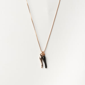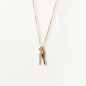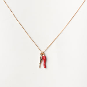 Porta un tocco di vivacità e fortuna al tuo stile con la nostra collana Cornetto. Questo affascinante gioiello presenta due ciondoli a forma di peperoncino, uno in oro lucido e l'altro in un vivace rosso smaltato.