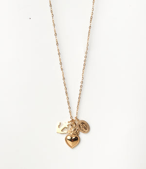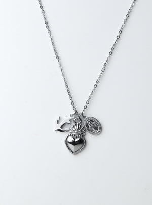 Celebra i simboli di fede, speranza e amore con la nostra collana Titty. Questo splendido gioiello presenta tre ciondoli distintivi: un'ancora, un cuore sacro e una medaglietta religiosa, ciascuno con un significato profondo e un design elegante.