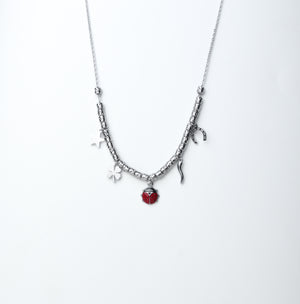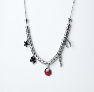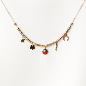 Porta con te un tocco di fortuna e stile con la nostra collana Portafortuna. Questo gioiello affascinante è adornato con una serie di ciondoli portafortuna: una stella, un quadrifoglio, una coccinella smaltata, un ferro di cavallo e un corno, ciascuno simbolo di buona sorte e protezione. Realizzata in acciaio inossidabile di alta qualità, questa collana offre una brillantezza duratura e una resistenza eccezionale.