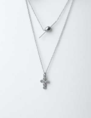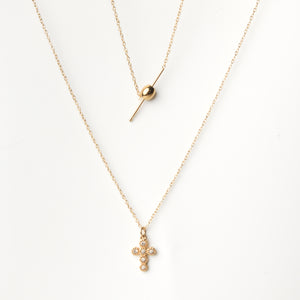 Aggiungi un tocco di raffinatezza spirituale al tuo stile con la nostra collana Croce Pendente. Questo elegante gioiello a doppio strato presenta un delicato ciondolo a croce tempestato di brillanti cristalli, accompagnato da una barra minimalista con una sfera dorata.