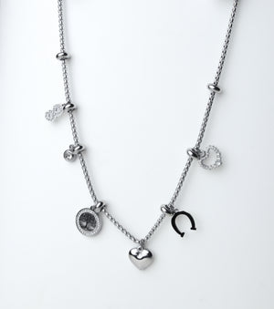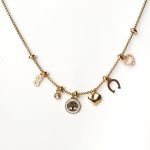 Questo gioiello unico presenta una serie di ciondoli simbolici, tra cui un cuore dorato, un albero della vita, un ferro di cavallo e altri amuleti scintillanti, ciascuno pensato per portare fortuna e positività. Il design sofisticato e l'alta qualità dei materiali garantiscono una resistenza e una brillantezza durature. Indossala da sola o abbinala ad altri accessori per un look personalizzato e di grande impatto.