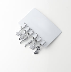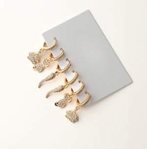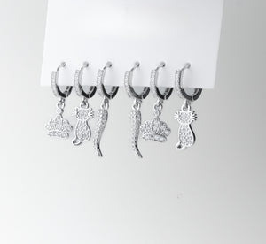 Il Set Kri è una collezione di orecchini in bijou color silver, caratterizzata da un design distintivo e affascinante. Questo set comprende sei paia di orecchini pendenti con vari ciondoli decorativi, tra cui corone scintillanti, piccoli gatti adorabili e altri elementi ornati da pietre brillanti.