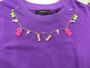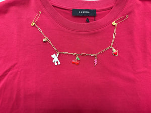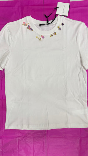 Un capo semplice ma ricco di personalità: t-shirt bianca con girocollo decorato da piccoli charms colorati che donano un tocco giocoso e originale. Realizzata in cotone morbido ed elasticizzato, veste comodamente da una taglia S fino a una XL, adattandosi con naturalezza alla silhouette. Perfetta da abbinare sia con jeans che con gonne per un look casual ma curato